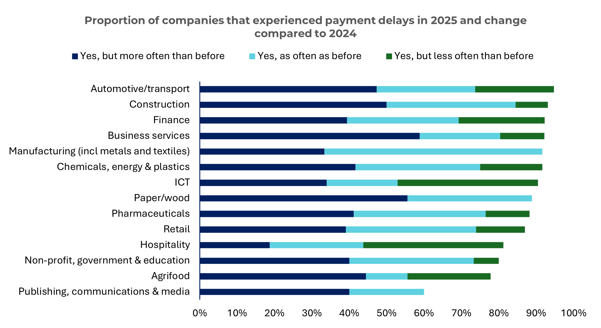 Stavebníctvo a automotive/dopravasú najviac postihnuté rastúcim oneskorením platieb (95 % a 93 %), zatiaľ čo vydavateľstvo, komunikácia a médiá (60 %), agropotravinárstvo (78 %) a neziskové organizácie, štátna správa a vzdelávanie (78 %) hlásia menej problémov. Často je to vďaka dlhším platobným podmienkam alebo silnejšej disciplíne odberateľov.