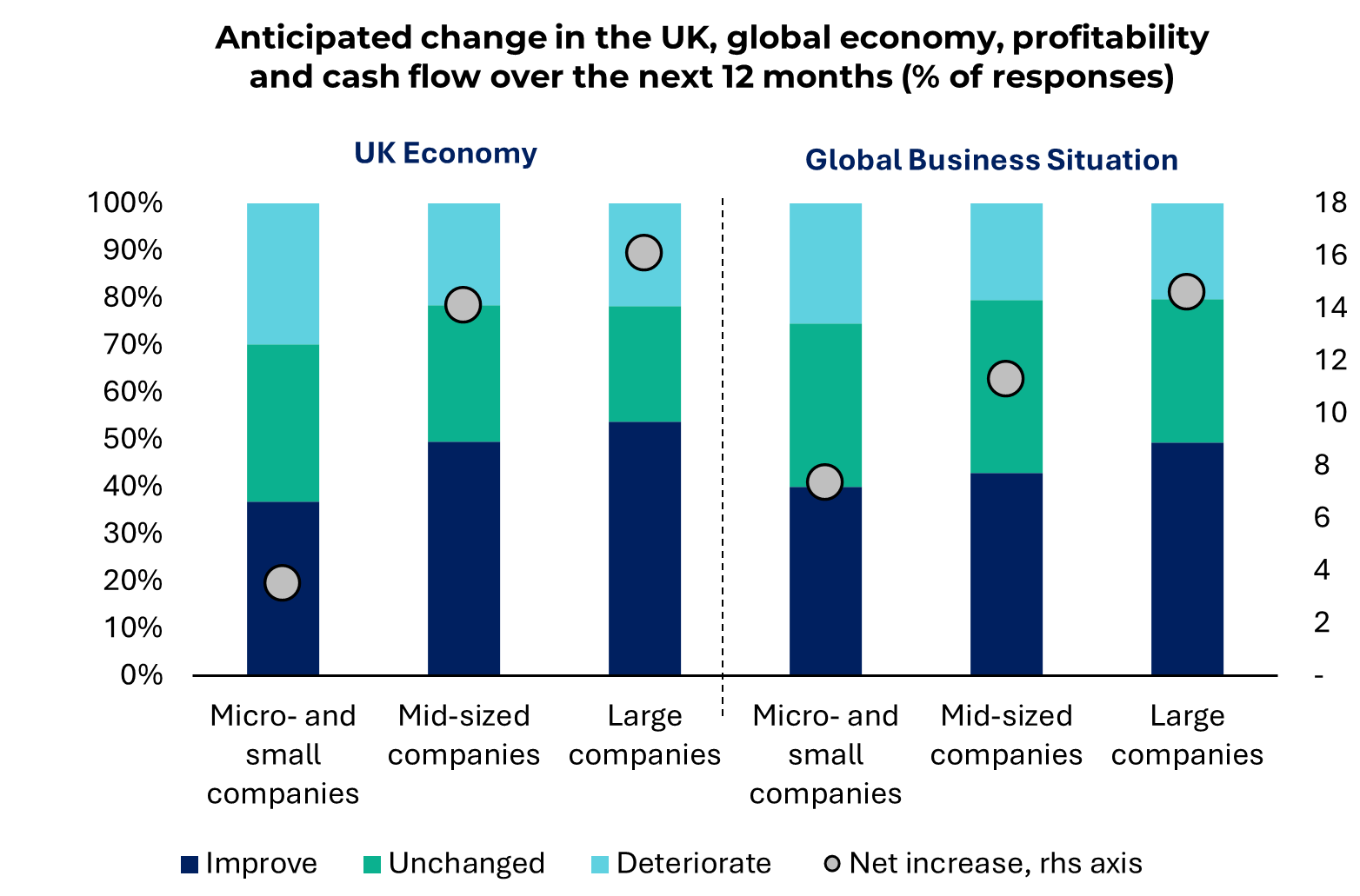 Napriek súčasným problémom existujú náznaky nádeje. Viac ako tretina spoločností očakáva, že v roku 2026 sa znížia oneskorenia platieb, k čomu prispeje zlepšujúca sa ekonomická nálada a očakávania vyššej ziskovosti a peňažných tokov. Tento optimizmus je však nerovnomerný, pričom mikropodniky a malé podniky zostávajú skeptickejšie - 66 % z nich sa domnieva, že hospodárstvo Spojeného kráľovstva sa v roku 2026 ešte zhorší alebo zostane nezmenené, a viaceré odvetvia naďalej čelia štrukturálnym rizikám vrátane volatility úrokových sadzieb, kybernetických hrozieb a narušenia dodávateľského reťazca.
