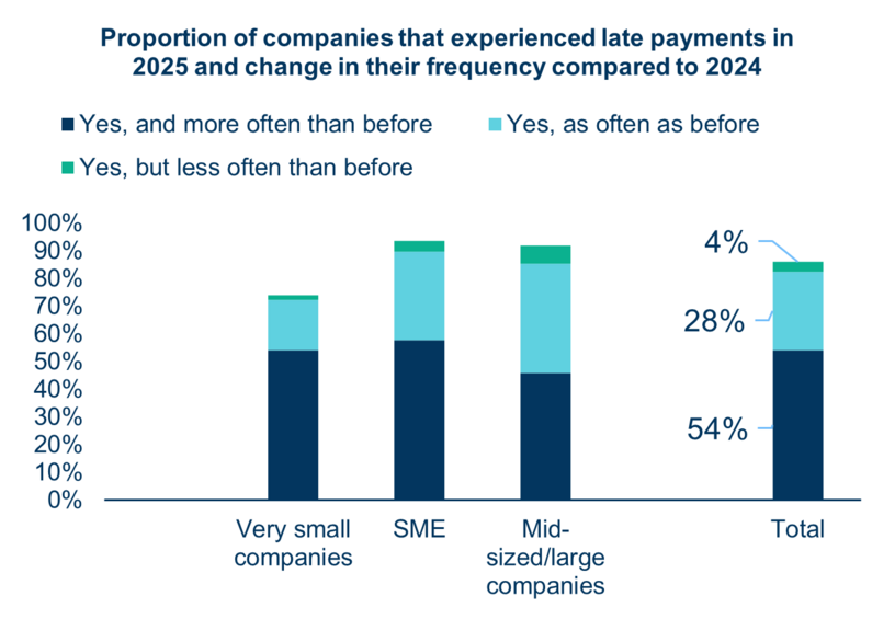 86 % francúzskych spoločností uvádza, že sa za posledných 12 mesiacov stretlo s oneskorenými platbami (v porovnaní s 82 % v roku 2023 a 85 % v roku 2024). Tento jav sa týka všetkých odvetví, pričom obzvlášť vysoký je podiel veľmi malých podnikov: viac ako polovica z nich v súčasnosti považuje vplyv na svoj cash flow za "kritický".