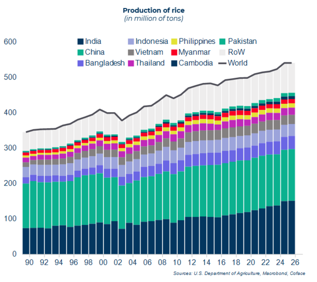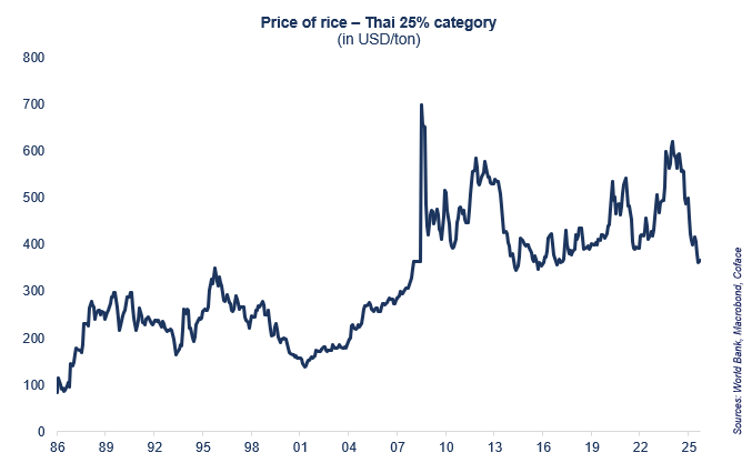 Od roku 2022 India, ktorá je najväčším svetovým vývozcom, obmedzila svoj vývoz, aby obmedzila prudký nárast svetových cien (19 % nárast v rokoch 2022 a 2023), ktorý súvisel najmä s vojnou na Ukrajine a zlými poveternostnými podmienkami v Ázii. Opätovné otvorenie vývozu v roku 2024 spolu s rekordnou úrodou v Ázii viedlo k poklesu cien o 35 % v priebehu jedného roka. Vzhľadom na rastúce prognózy produkcie na rok 2026 a potenciálny návrat La Niña vo štvrtom štvrťroku 2025 očakávame v roku 2026 rastúci prebytok ponuky. Očakáva sa, že ceny budú naďalej klesať minimálne do konca roka 2025, pričom v roku 2026 sa pravdepodobne stabilizujú na úrovniach, ktoré neboli zaznamenané za posledných 10 rokov.